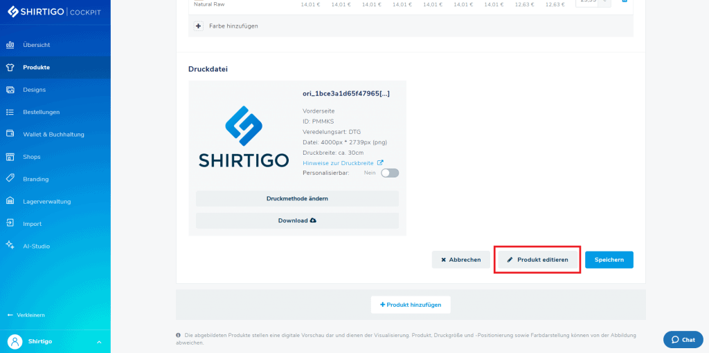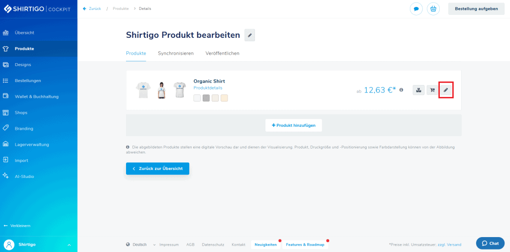 Schritt 1: Navigiere im Cockpit zum Reiter Produkte und wähle anschließend die gewünschte Produktkollektion aus. Klicke bei dem entsprechenden Produkt auf das Stift-Symbol (Bearbeiten).