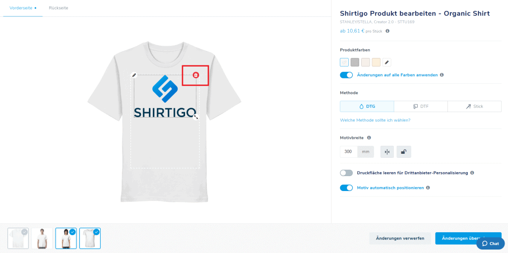 Schritt 3: Der Produkte Editor öffnet sich wie gewohnt. Fahre mit der Maus über das bestehende Design. Sobald du darüber hoverst, erscheint oben rechts ein Löschsymbol. Dieses kann genutzt werden, wenn das Design vollständig ausgetauscht werden soll. Alternativ kann hier auch nur die Größe des Designs angepasst werden.