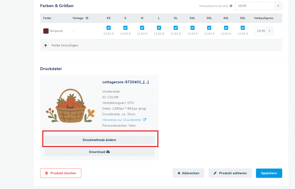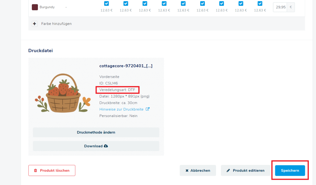 4. Wenn Sie sich nun die Übersicht ansehen wird bei der Veredelungsart DTF angezeigt. Anschließend klicken Sie unten rechts auf speichern und der Vorgang ist abgeschlossen.