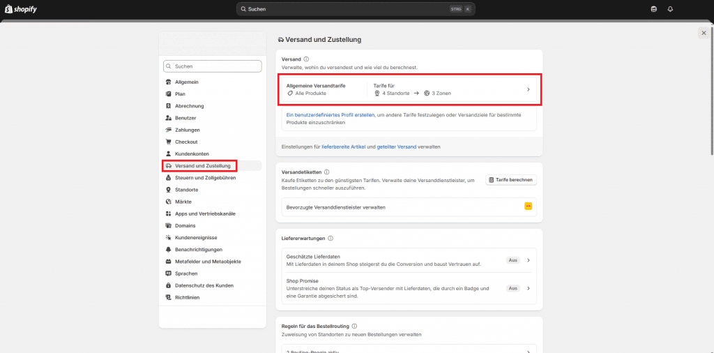 1. Wähle „Versand und Zustellung“ → „Allgemeine Versandtarife“.