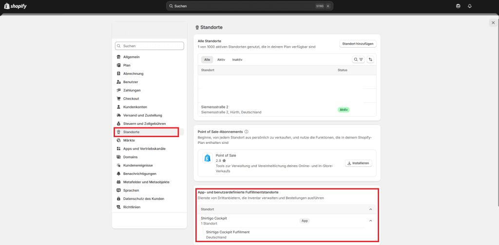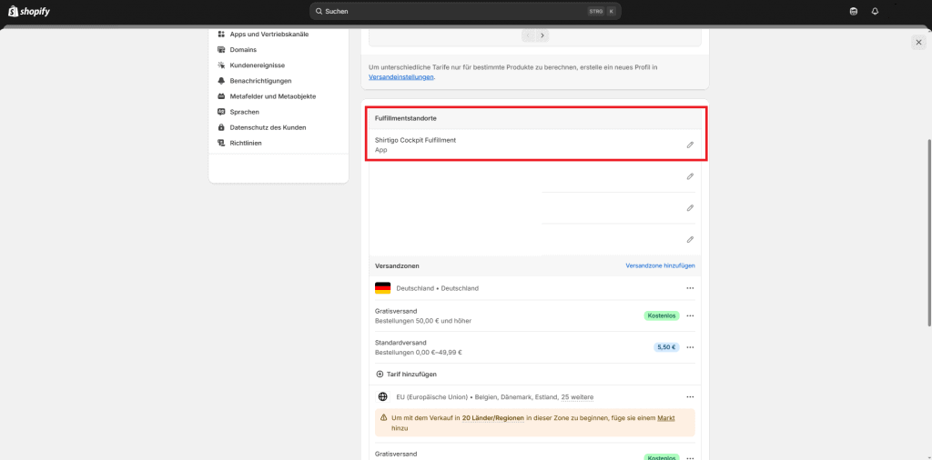 3. Stelle sicher, dass „Shirtigo Cockpit Fulfillment“ hier hinterlegt ist.
